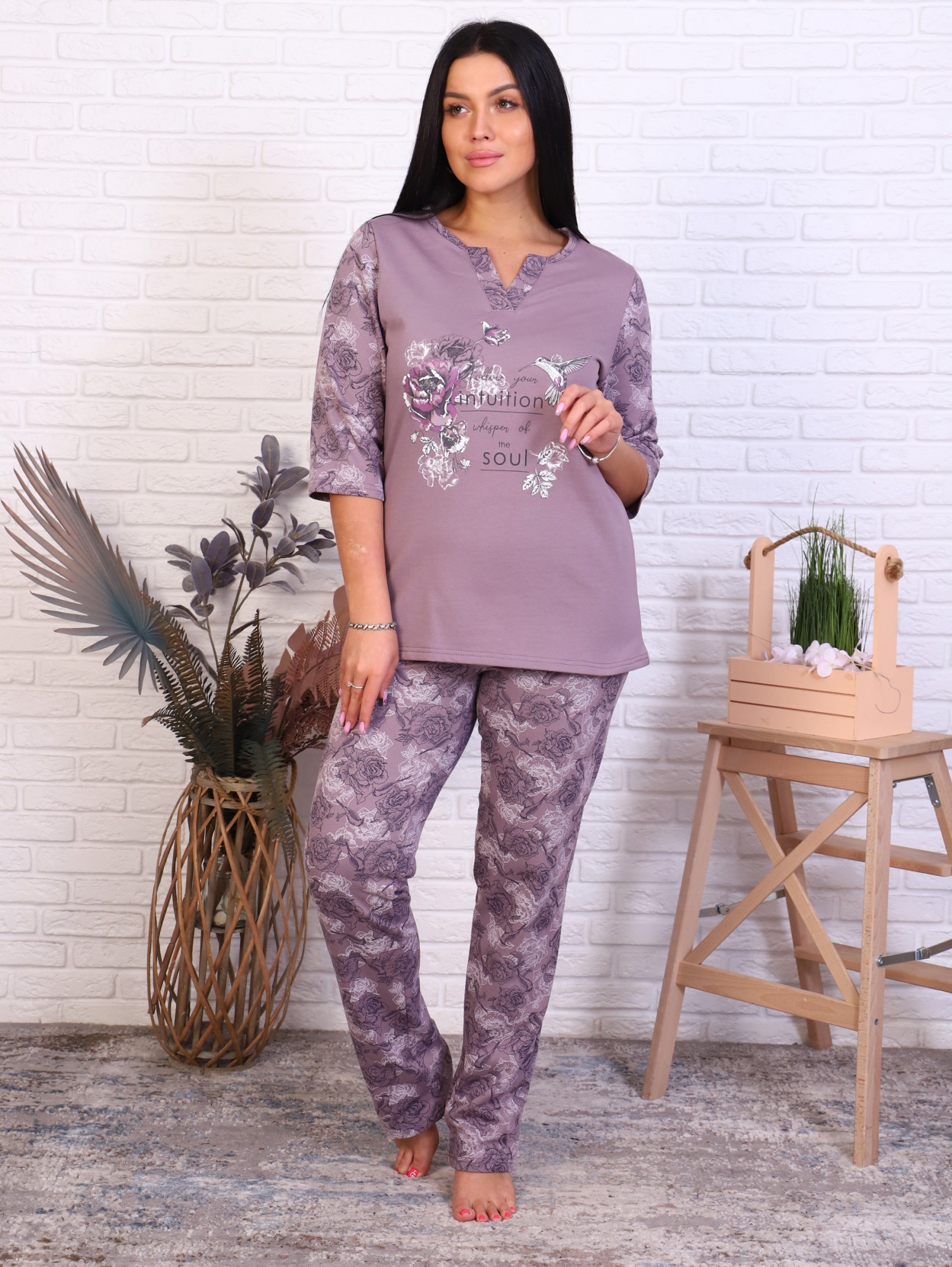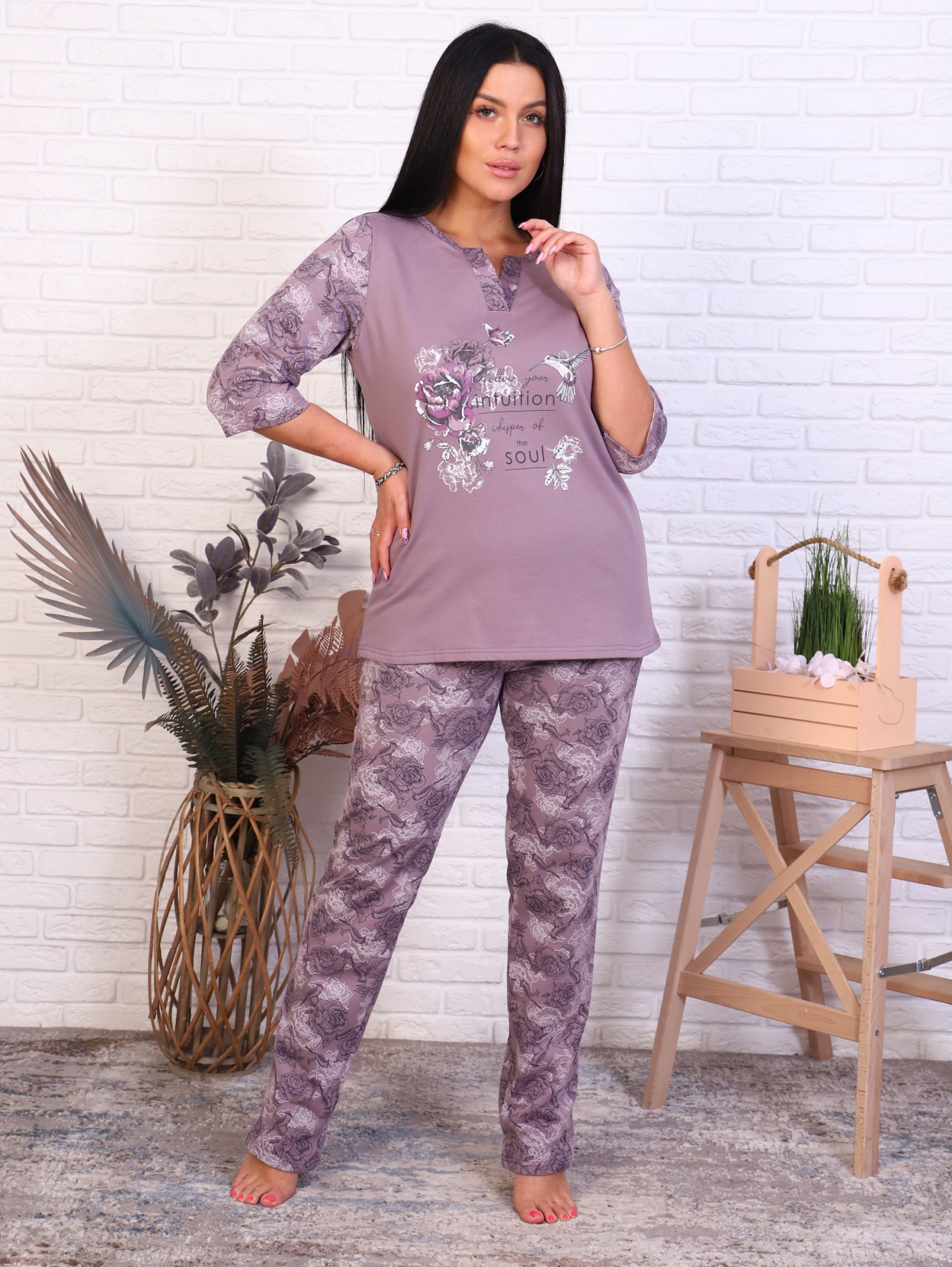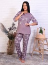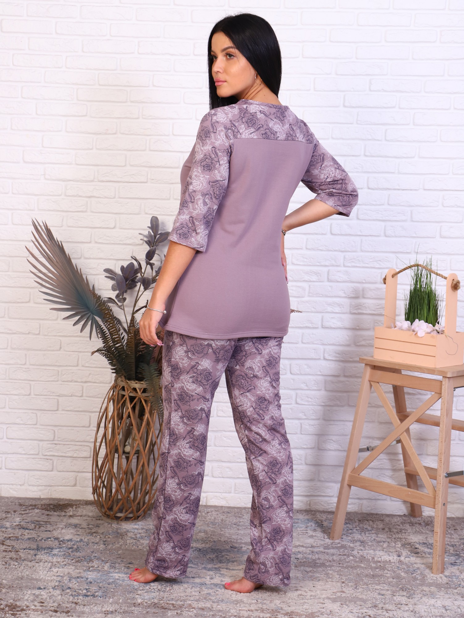Пижама с брюками футер с начёсом, принт, кофе (945-2)